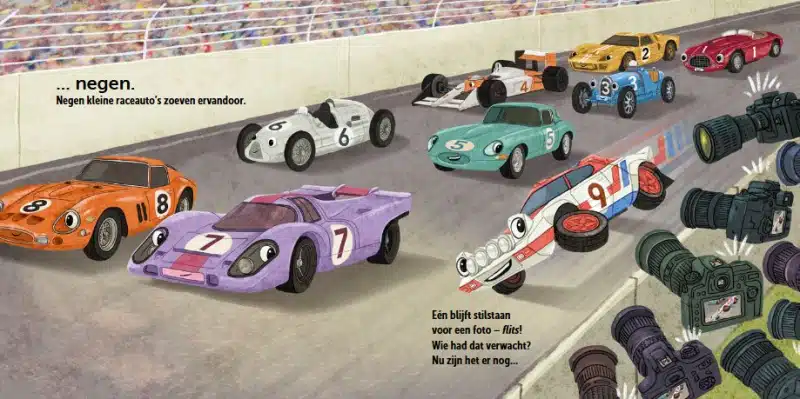 Racen, rijmen รฉn tellen in รฉรฉn in 10 kleine raceauto’s van Annie Bailey, het perfecte kartonboek voor kleine race- en autofans!