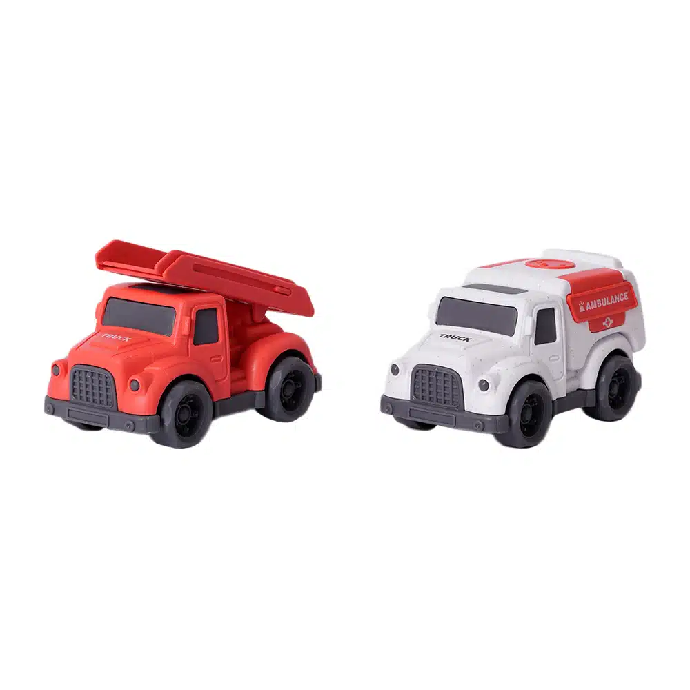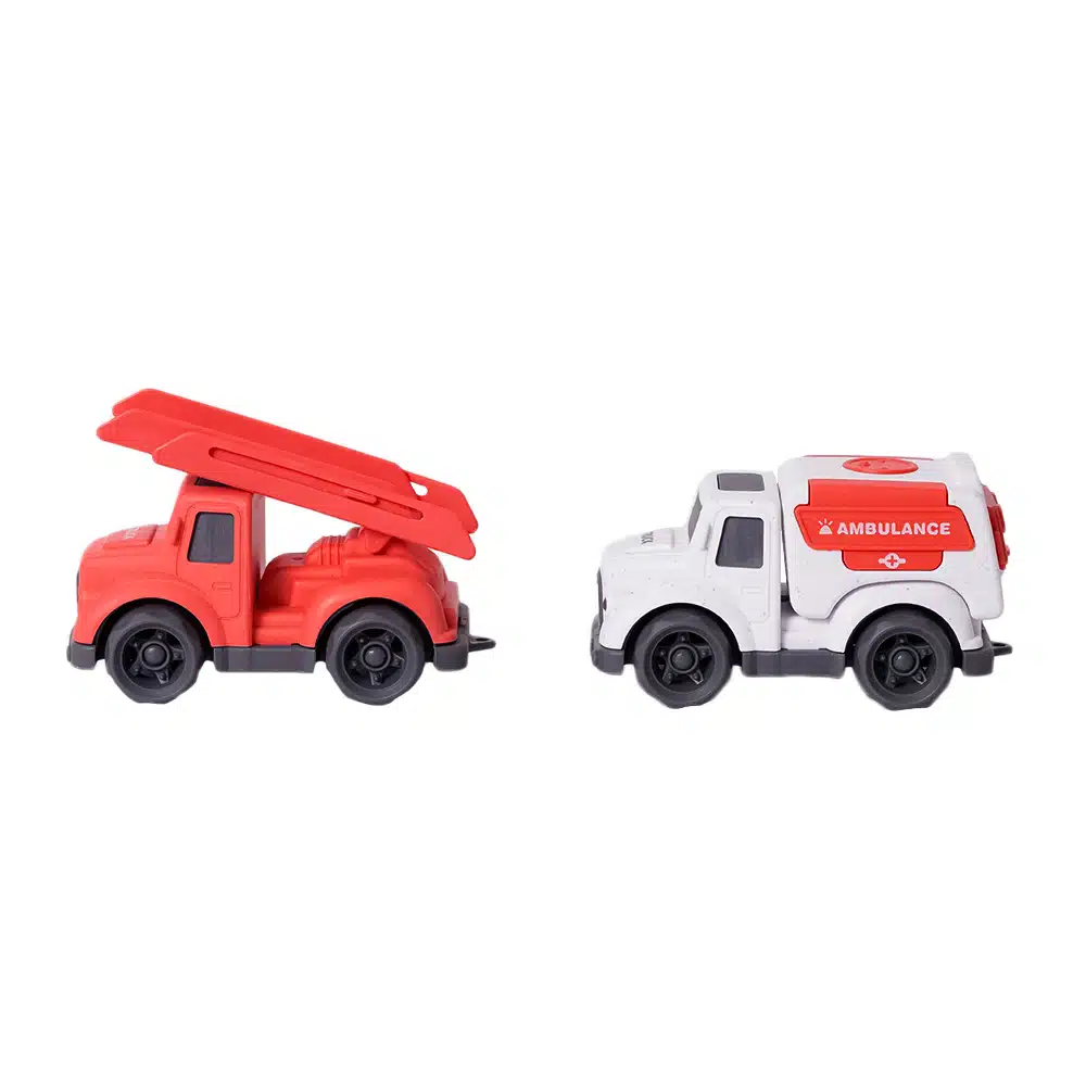 Twee stoere hulpdienstvoertuigen in één set, met een brandweerwagen en ambulance, perfect voor kleine handjes met grote avonturen.