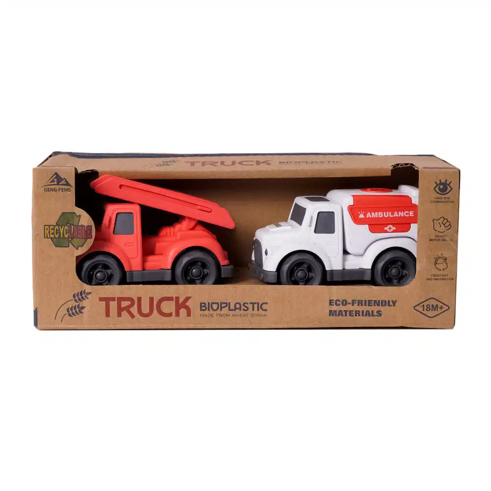 Klein van formaat, groots in speelplezier! Deze BIOplastic Truckset bestaat uit twee stoere hulpdienstvoertuigen van elk 10,5 cm lang: een rode brandweerwagen met uitschuifbare ladder en een witte ambulance voor snelle noodgevallen. Perfect voor kleine handjes én grote avonturen.