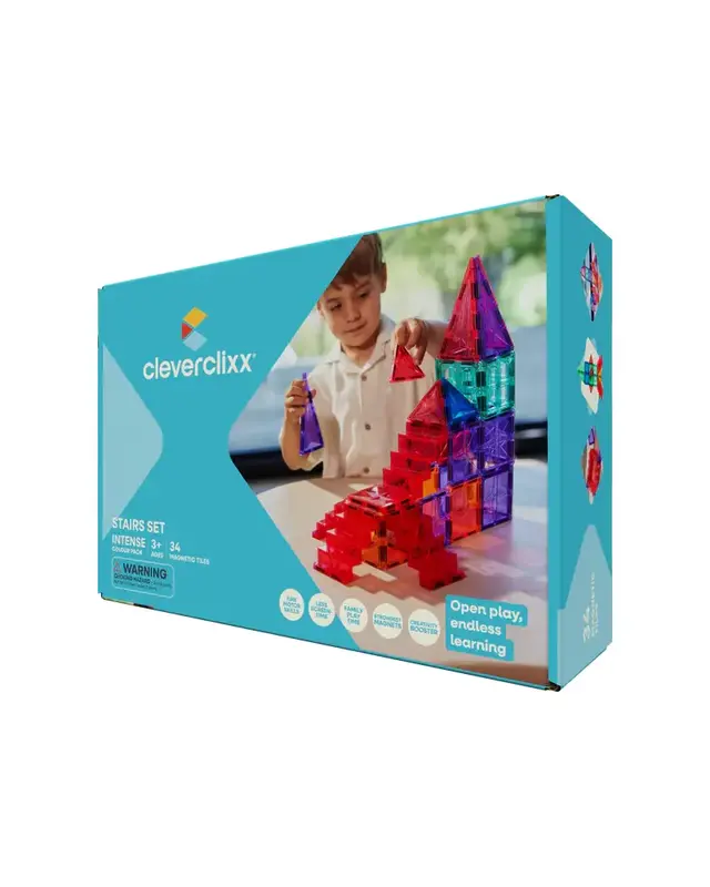 Til je bouwwerken naar een hoger level met de Cleverclixx Stairs Set Intense! Deze set van 34 magnetische tegels en traptreden in diepe, krachtige kleuren laat kinderen klimmen, ontdekken en bouwen op nieuwe hoogtes. Maak avontuurlijke routes, geheime torens of echte raceparcours — met deze set wordt elk idee nóg leuker!