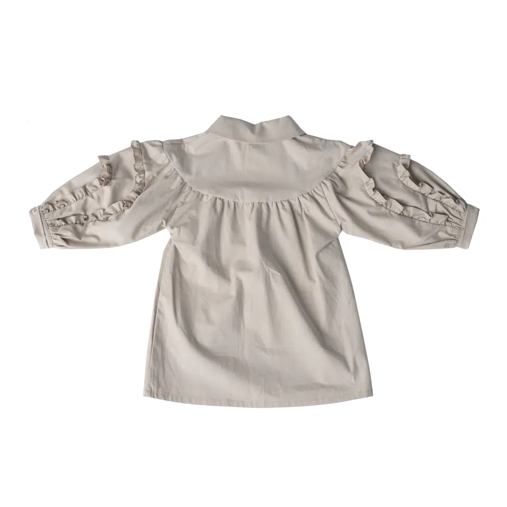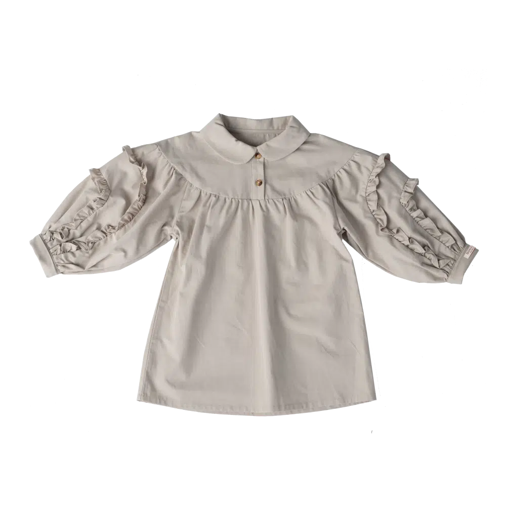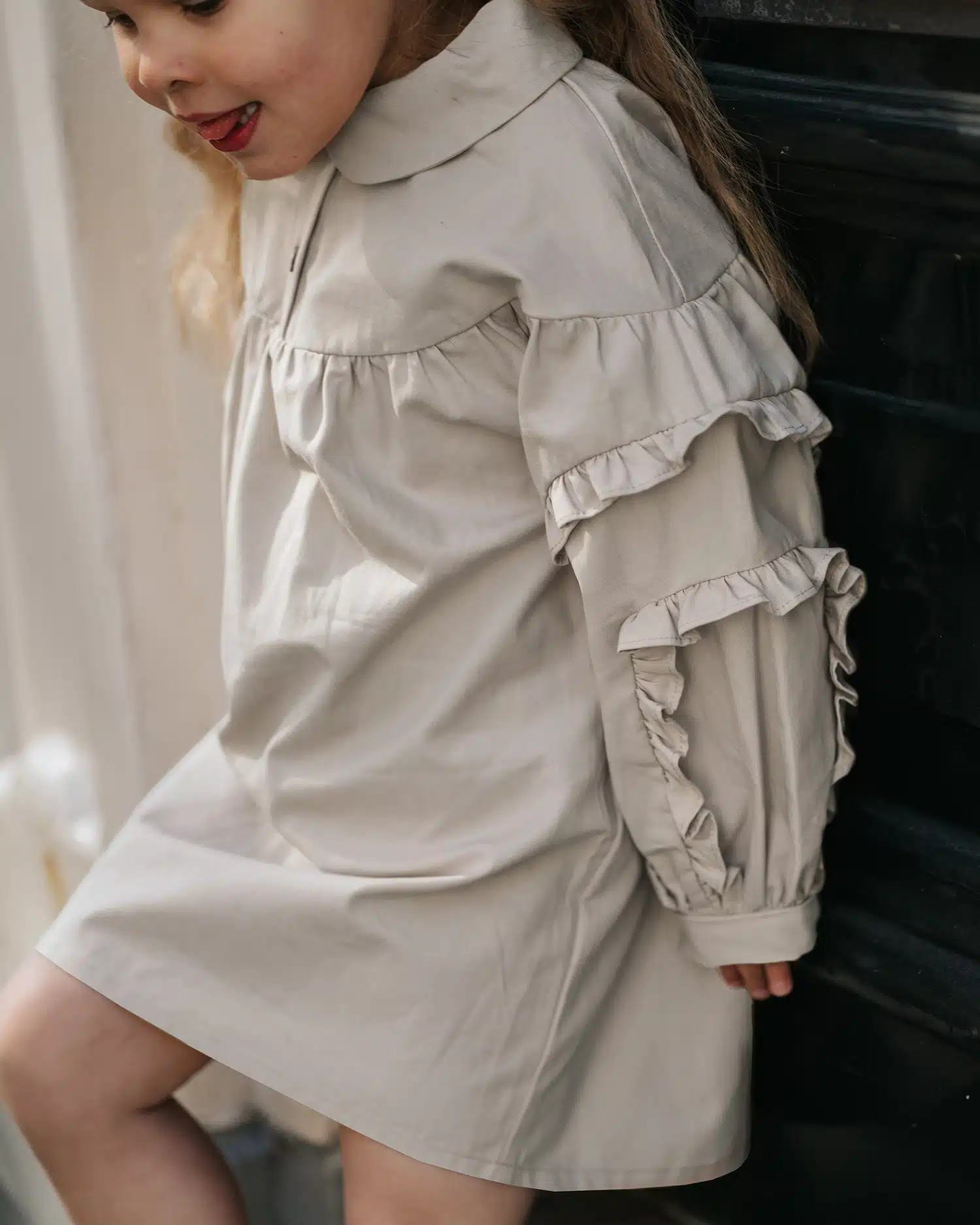De Everoux Jurk in Soft Taupe van Donsje Amsterdam is een elegante statement dress met romantische details. De jurk heeft prachtige gelaagde ruffles langs de mouwen, een zachte A-lijn en een verfijnde Peter Pan-kraag voor een klassieke, tijdloze look. De stof voelt comfortabel en soepel aan, waardoor de jurk perfect is voor zowel dagelijks gebruik als feestelijke momenten. De zachte taupetint maakt het een ideaal item om eindeloos te combineren.