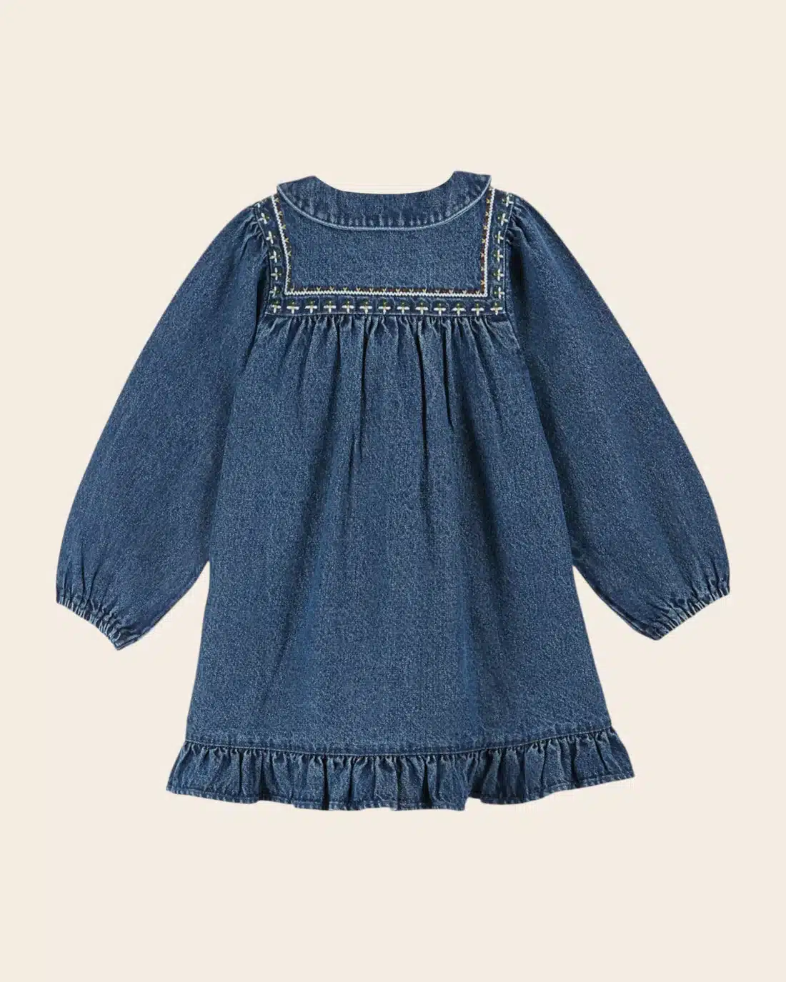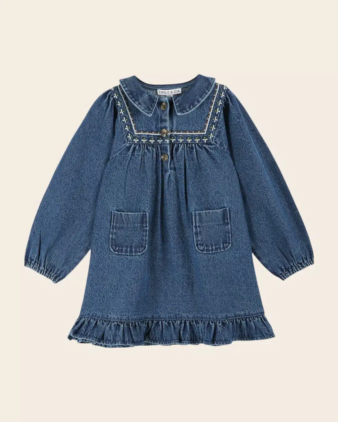 Stijlvolle denimjurk van Emile et Ida, gemaakt van dik katoen en afgewerkt met verfijnde borduursels langs het juk. Het model heeft lange mouwen met elastische manchetten en een speelse volant aan de zoom. Voorzien van twee opgestikte zakken en een knoopsluiting bij de platte, puntige kraag. Perfect voor het tussenseizoen, maar met een truitje eronder en een maillot ook ideaal in de winter.