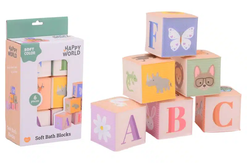 Set met 6 Happy world zachte bad blokken met afbeeldingen van letters en leuke vrolijke afbeeldingen.