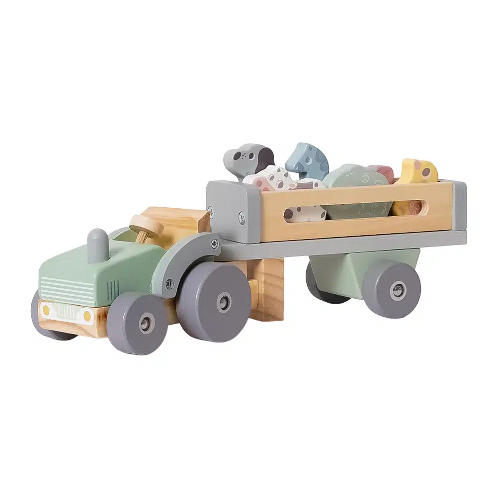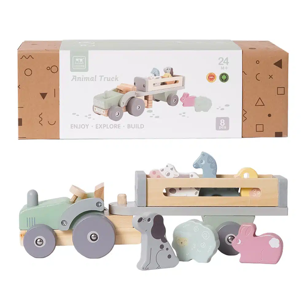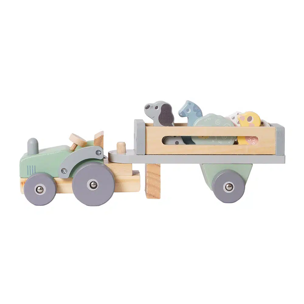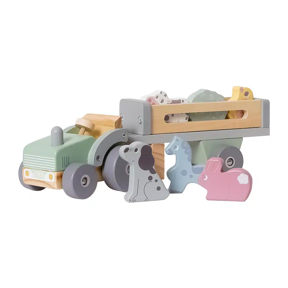 Deze schattige pastelkleuren houten traktor wordt geleverd met dierenfiguurtjes en is een complete 8-delige set. Ideaal voor kinderen vanaf 24 maanden die graag met dieren en voertuigen spelen.