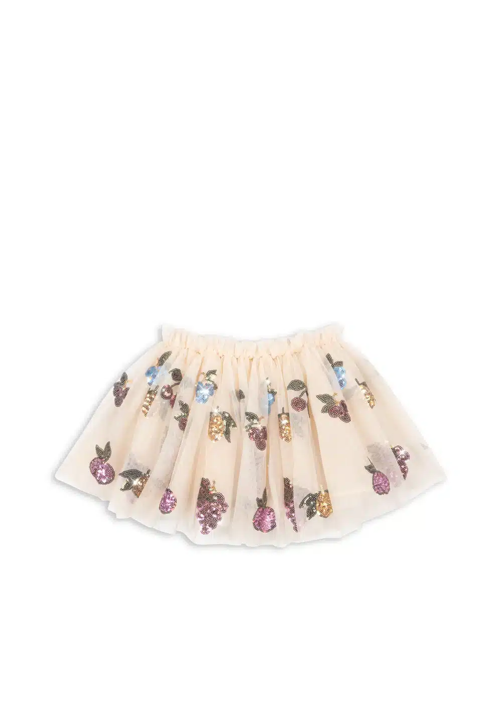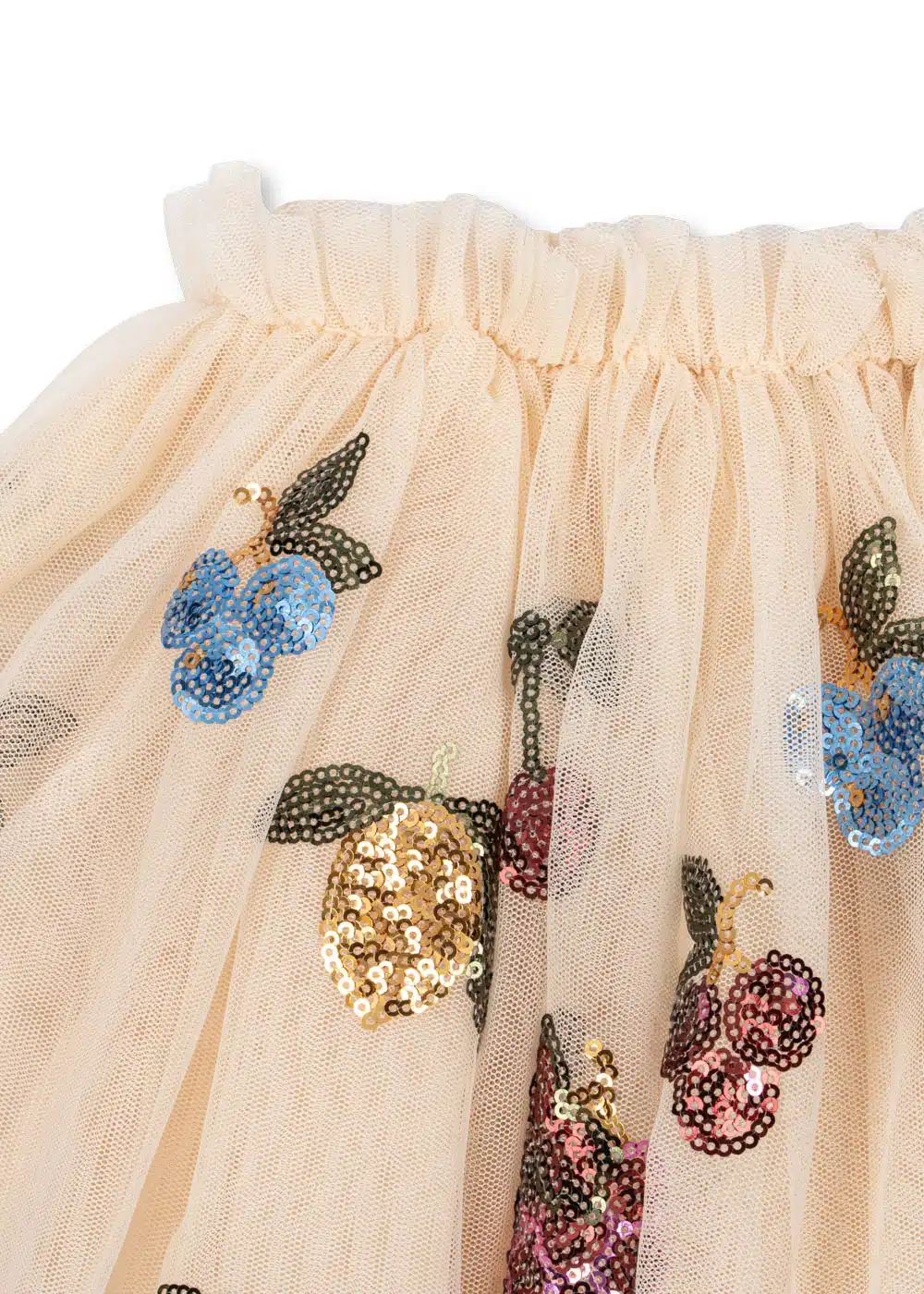Deze prachtige wijde tule rok met zachte katoenen voering en elatische taille zorgt voor je dagelijkse vitamines! Versierd met pailletten!