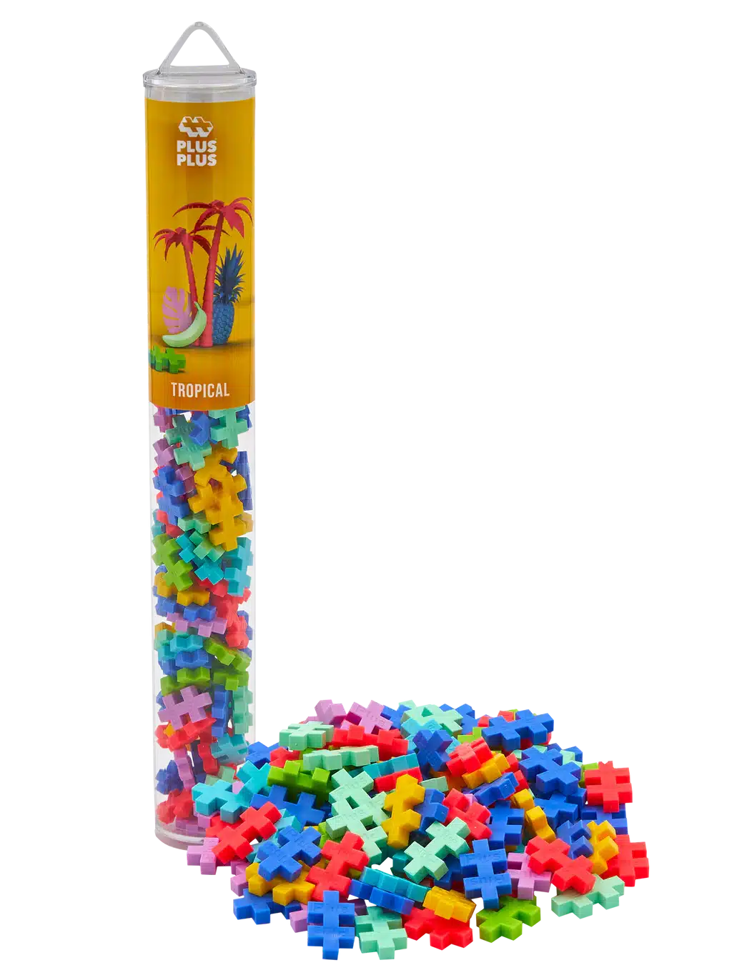 Ontdek 100 Plus-Plus steentjes in tropische, vrolijke kleuren in deze tube! Met deze kleurrijke steentjes kun je alles bouwen wat je maar wilt. Leer de basis van het bouwen met het inspiratieboekje en maak je eigen creaties – van coole 3D-figuren tot mooie 2D-patronen.